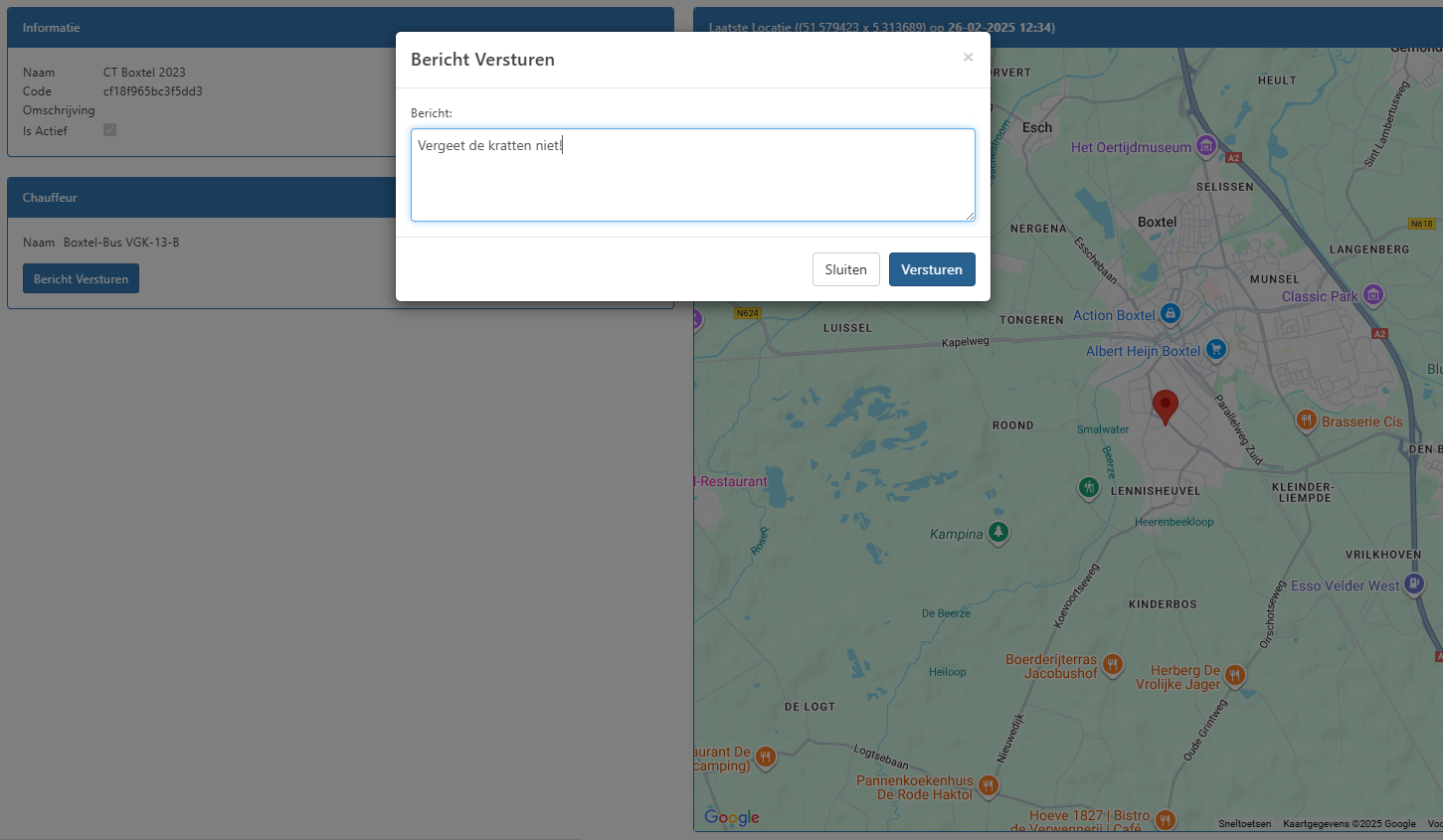 Even een berichtje naar de chauffeur? Ook dit is mogelijk! Het bericht komt als chatbericht binnen bij de juiste chauffeur. Zo wordt de chauffeur gemakkelijk op de hoogte gehouden van eventuele veranderingen of bijzonderheden.